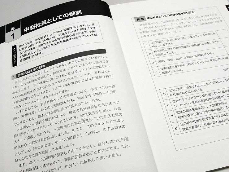 中堅社員として、組織の第一線で活躍し続けていくための役割意識やキャリア観、成長意欲、自己管理能力を醸成します。仕事を的確に推進し、組織から期待される成果を創造し続けるための目標達成や問題解決のスキルを身につけます。