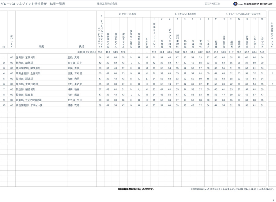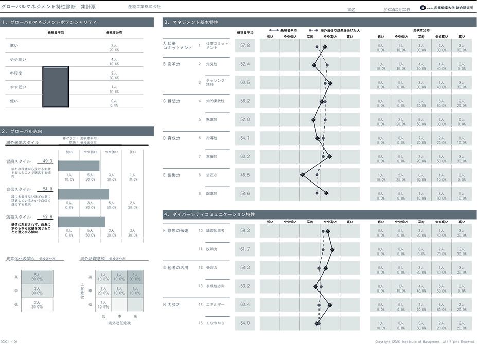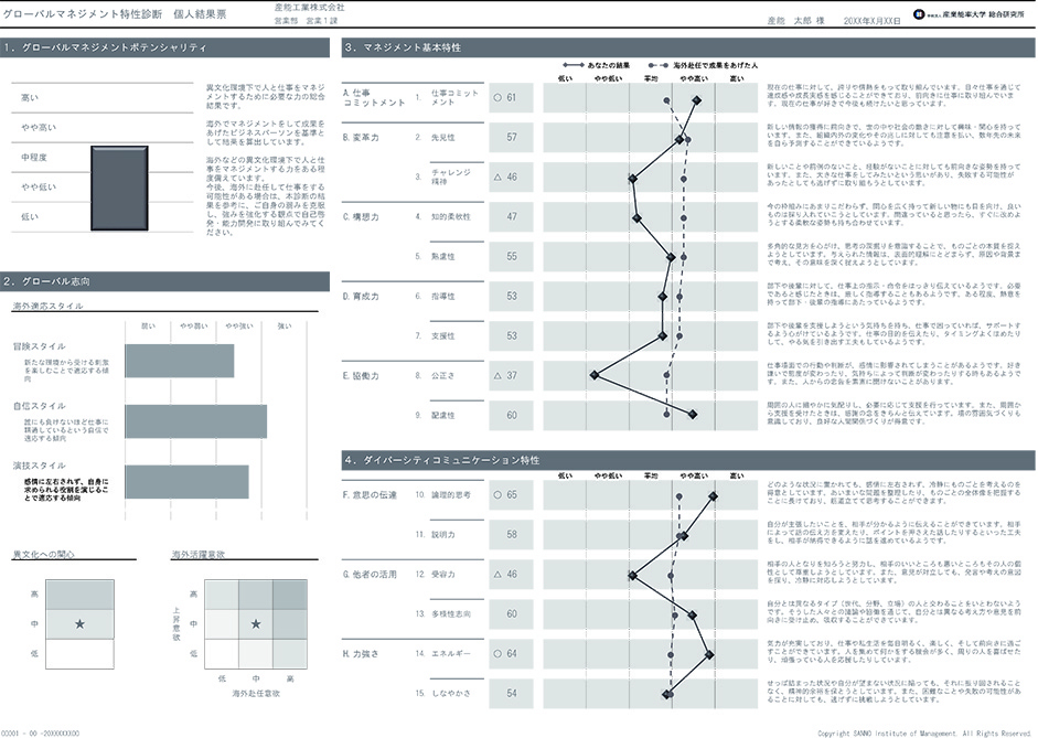 メンバーを育て活かしながら、職場の成果をあげるために必要な「マネジメント基本特性」、多様なメンバーと意思疎通し率いるために必要な「ダイバーシティコミュニケーション特性」をどの程度備えているかが分かります。 また、海外(異文化環境)での適応スタイルと、そこで活躍しようとする意欲も明らかにします。