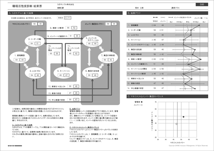 OJD(オージェイディ)は、管理者のマネジメントが職場にどう影響しているか測定し、管理者に行動変容を促す職場診断です。 マネジメントの現状と職場の状態を、原因と結果の相関関係で把握し、学習が起こる職場、人が育つ職場への変革を支援します。