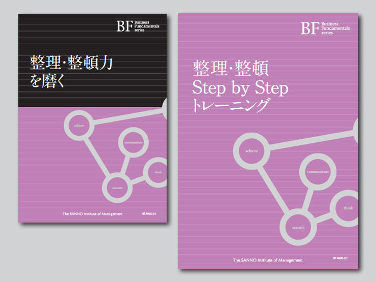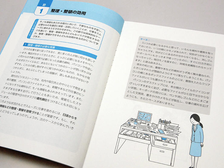 1. まず、汎用的な整理・整頓の基本ステップを学習します。2.「モノ」「情報」「時間」「心」の4つについて、整理・整頓を怠ったときのリスクを確認したうえで、具体的な整理・整頓の仕方を共通の基本ステップに沿って身につけていきます。
