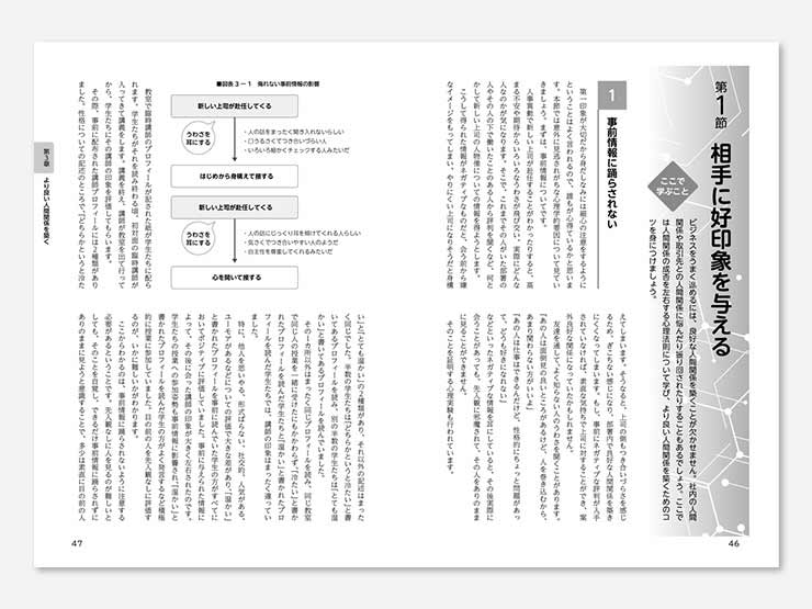 「自己理解」「他者(相手)理解」をベースにした「実践的テーマ」の学習を通じて、確実に理解を深めることができます。具体的な仕事の場面を取り上げ、そこに見られる心の法則・メカニズムを豊富な図解やイラストで分かりやすく解説します。これらを理解した上で、効果的な仕事の進め方のコツやテクニックを習得します。