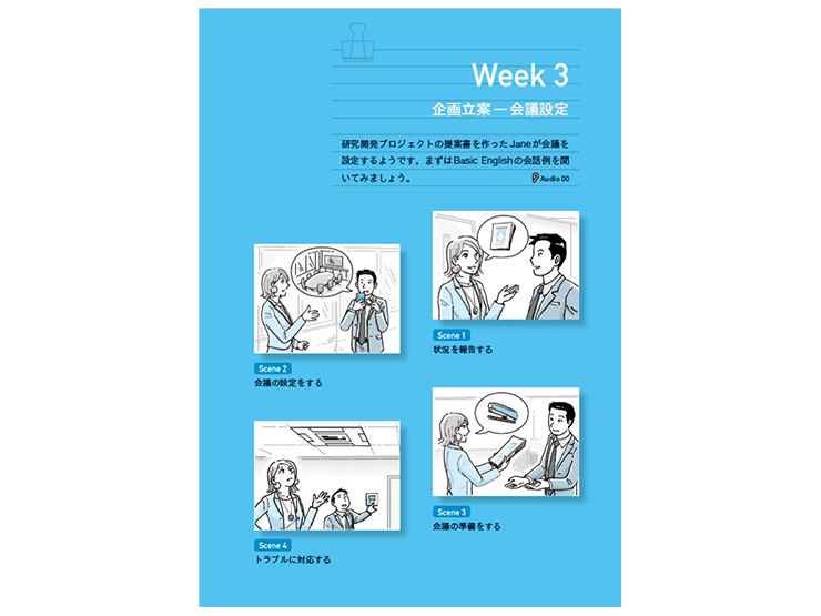 1週間に1つの場面設定:4コママンガで場面イメージをつかみ、ビジネスを意図通りに進める戦略的な交渉や会話とは何か、場面・状況から学びます。Mindset and Tips:英語話者とのコミュニケーションに必要な交渉の仕方、ものごとの捉え方などのヒントが示されます。