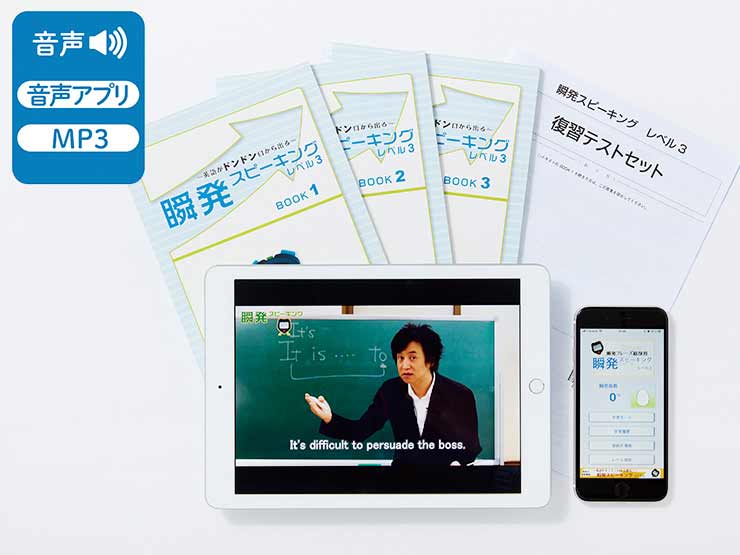 レベル3では、高校レベルの応用英文法に則った「360の短い例文」と実践で使える簡単な「180の状況別定形文」を徹底学習します。監修は英語教育のカリスマ・安河内哲也先生。スピーキングが苦手だった安河内先生が、自身の英語力を英検1級レベルにまで高めた秘伝の学習方法を、まるごと講座にしました。安河内先生からの応援メッセージで効率の良い学習のコツがわかり、やる気がぐんぐん増します。