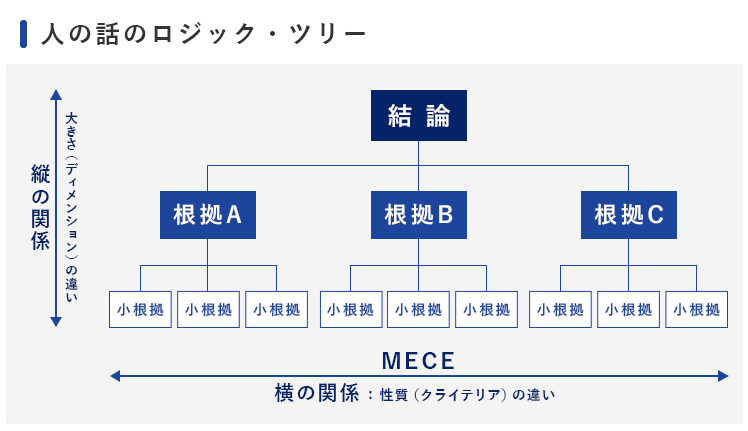 ロジック・ツリーで人の話の内容を構造化する場合、全体を総括した情報は「結論」であり、それを支える情報が「根拠(小根拠)」となります。