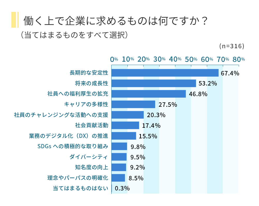 働く上で企業に求めるものは何ですかという設問(当てはまるものをすべて選択)では、「長期的な安定性(67.4%)」、「将来の成長性(53.2%)」が上位にきました。