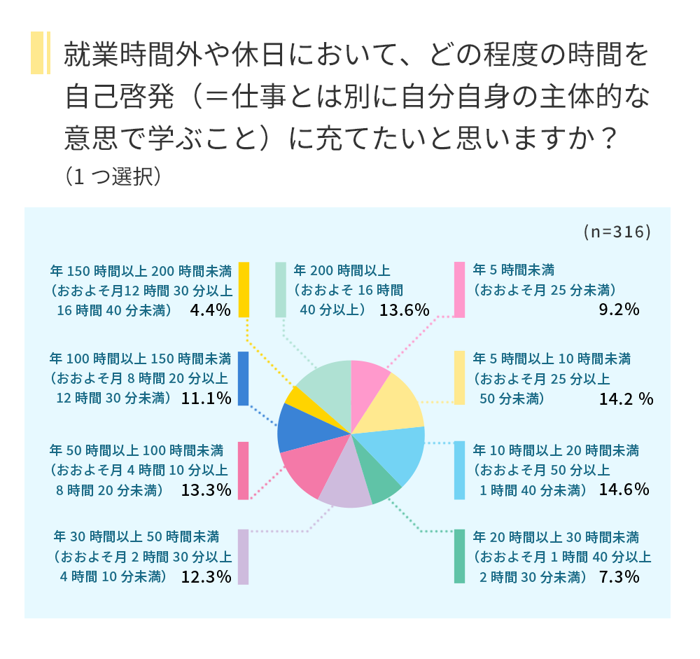 就業時間外や休日において、どの程度の時間を自己啓発に充てたいかでは、「年10時間以上20時間未満(14.6%)」が最も多い結果となりました。
