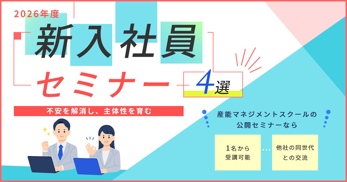 新入社員セミナーでは、「学生から社会人への意識の転換」と「社会人としての基本の習得」を行います。産能マネジメントスクールでは、新入社員が身につけておきたい基本を学べる4つのセミナーを開催しています。